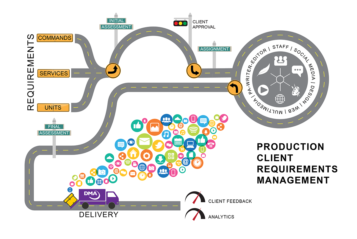 Maps the production process from receiving requirements from clients to delivery.